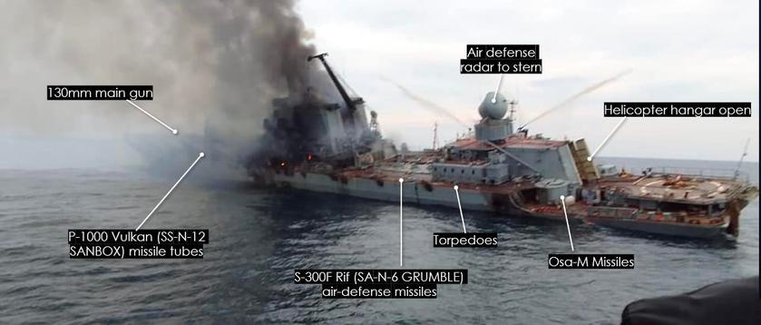 Численні чорні плями на борту можуть свідчити про внутрішній спалах у відсіках корабля. Боєголовок і горіння залишків ракетного палива, що сталися внаслідок вибуху, які призвели до детонації протичовнових бомб реактивного бомбомета РБУ-6000 у льохах, які розташовувалися нижче за ватерлінію. Антени РЛС ППО та ЗРК перебувають у діаметральному положенні. А ось пускові установки крилатих ракет не пошкоджені.