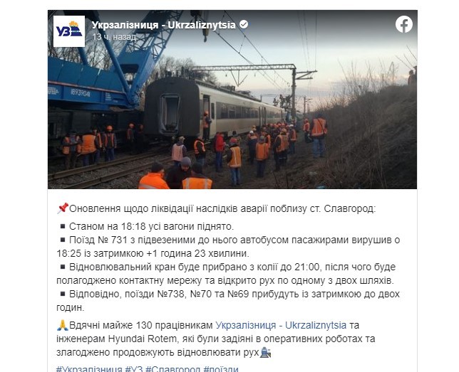 29 березня під Запоріжжям частково зійшов з рейок швидкісний потяг Інтерсіті. Інцидент стався з поїздом № 732 Київ – Запоріжжя.