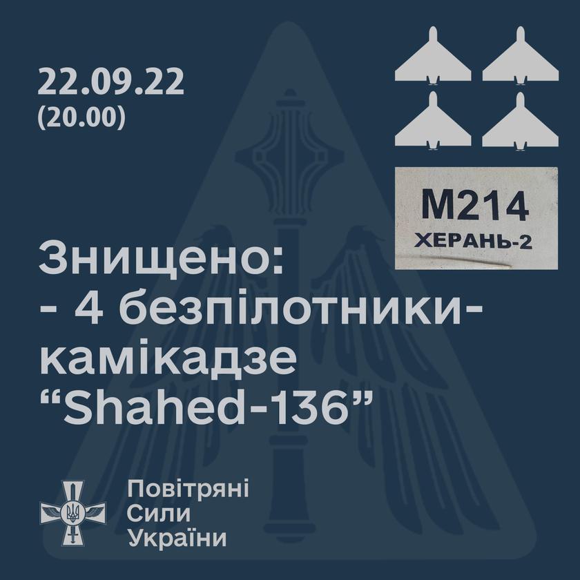 “22 вересня, близько 20:00, у Миколаївській області воїнами зенітної ракетної Одеської бригади Повітряного командування “Південь” двома зенітними керованими ракетами середньої дальності збито одразу чотири російські дрони-камікадзе Shahed-136 іранського виробництва”, – ідеться в повідомленні.